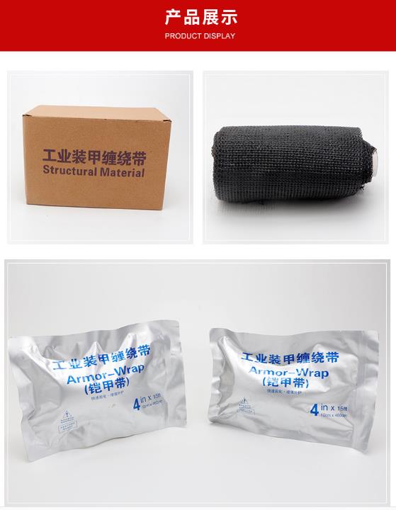 工業(yè)裝甲纏繞帶密閉于鋁塑復合袋中,即開即用,使用時無需特殊設(shè)備,只要簡單地將繃帶?于水中數(shù)秒,然后纏繞成形,即可在10分鐘內(nèi)完成固化承重,18小時后則能體現(xiàn)完美的機械防護性能。